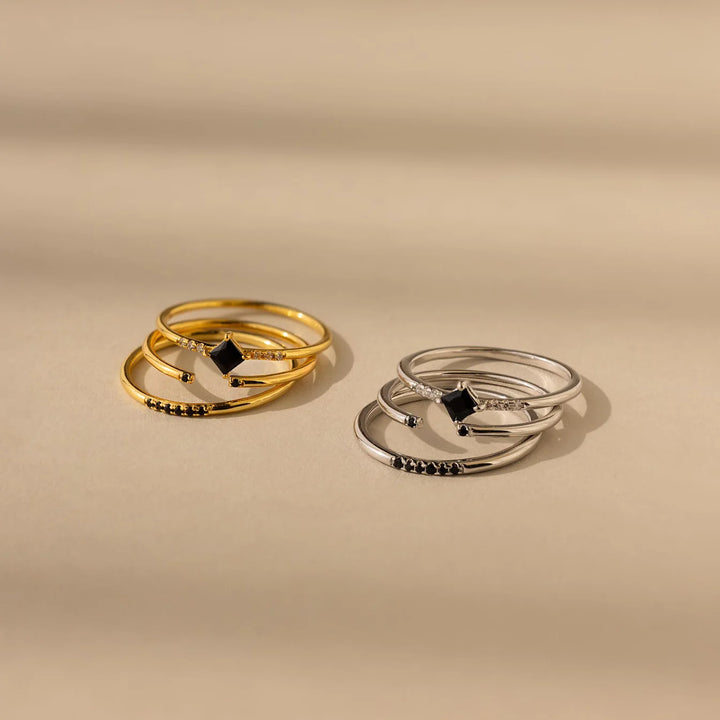 Dive into the mystery and elegance of the Black Abyss Ring Set from LUXEZ. This daring duo features sleek 925 sterling silver bands adorned with striking black CZ stones, blending modern minimalism with dramatic flair.